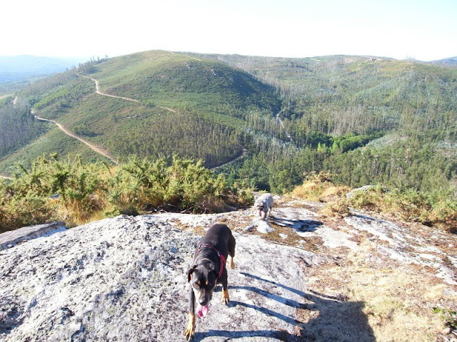 Hoy fue un día muy caluroso por estas latitudes y a nuestros dueños sólo se les ocurre ir de senderismo con la que estaba cayendo. La idea era hacer una ruta que supuestamente discurriría por la orilla del río, con unos cuantos molinos y mucha sombra. La ruta es ésta, sólo que la hicimos en sentido contrario y al principio tocó subir y subir a pleno sol. Nosotros llegamos arriba con una sed!!